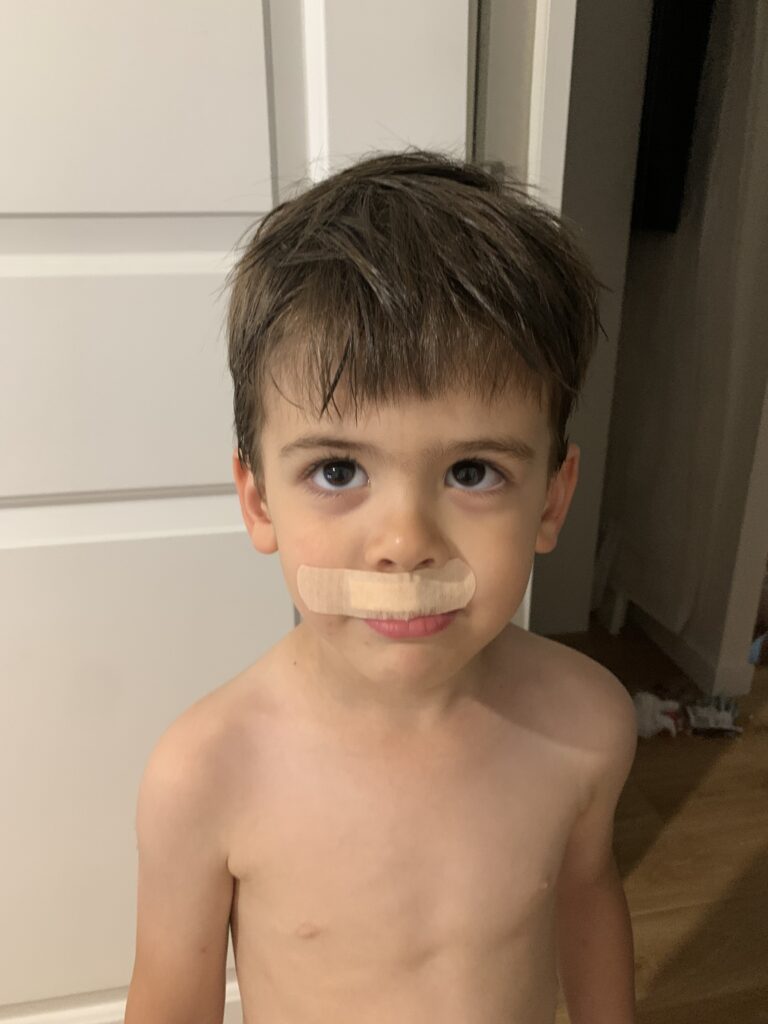Apparemment il s’était fait mal au niveau de la lèvre, alors il est allé se mettre un pansement haha.