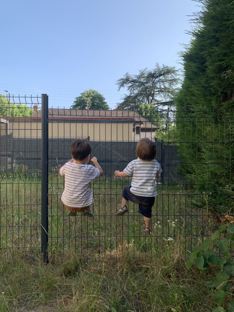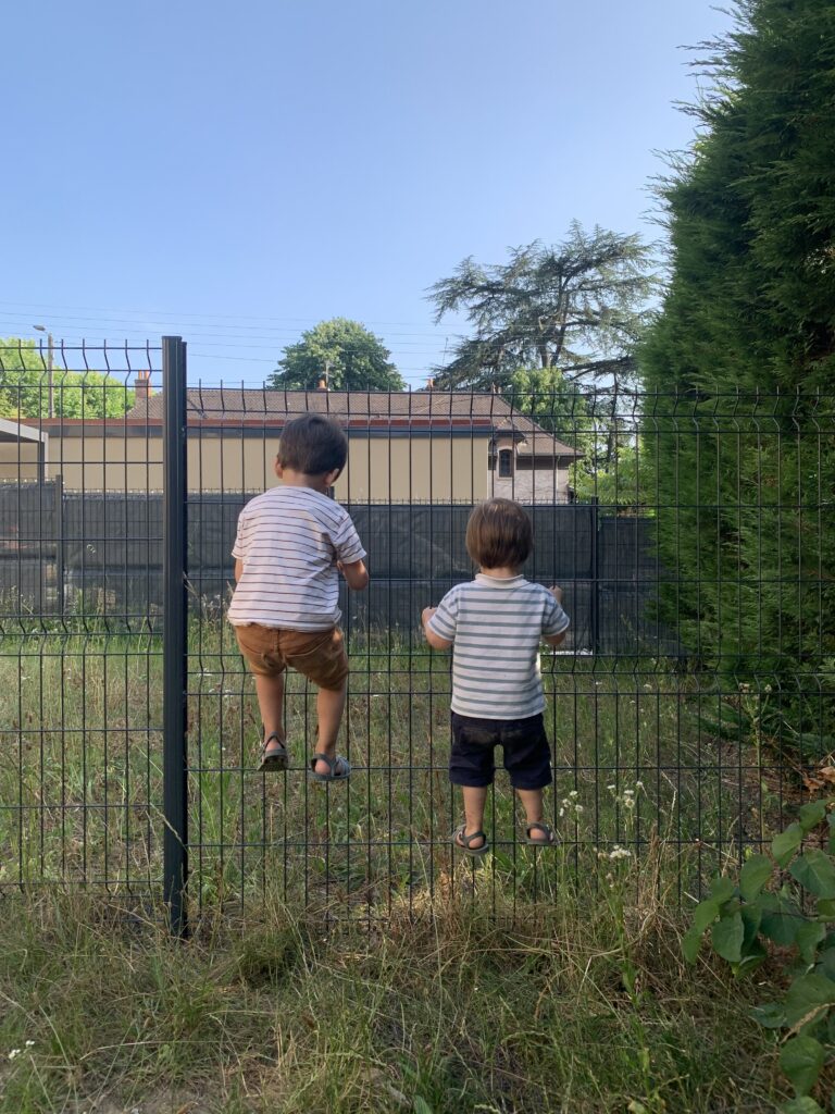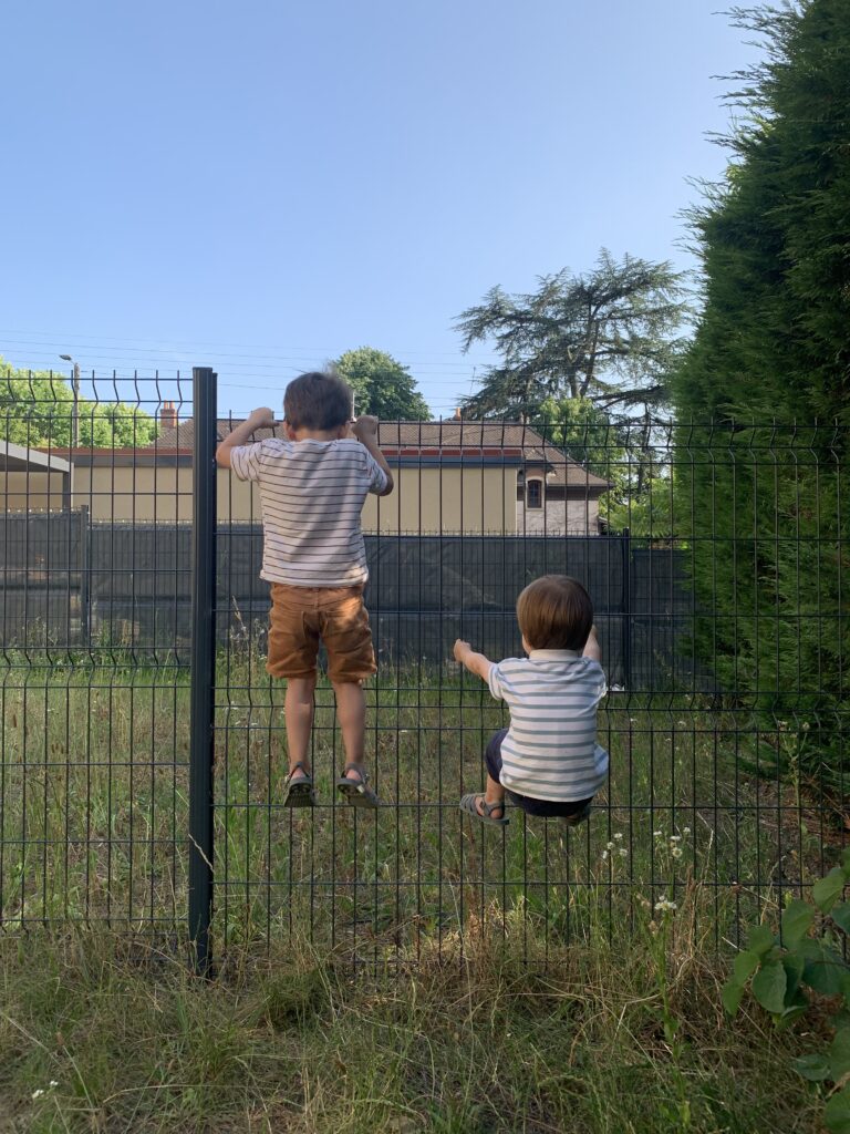 Avoir des garçons, c’est essayer de ne pas paniquer quand ils se jettent du sable et de la terre sur la tête et dans les yeux, quand ils courent dans tous les sens en brandissant des bâtons et autres outils de jardinage pointus, quand ils jettent des cailloux partout y compris chez les voisins, ou quand ils se mettent à escalader le grillage…. Et j’en passe.