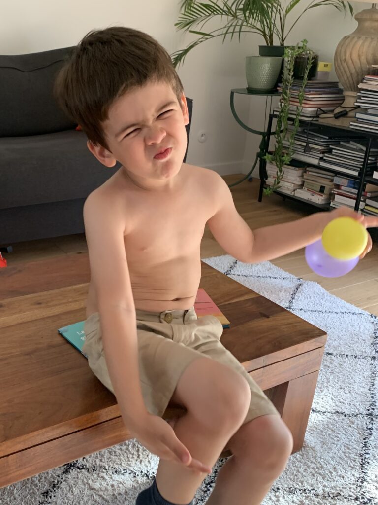 Ce petit ange peut aussi devenir diabolique en un quart de seconde : il se comporte très très souvent comme une véritable tornade avec moi, qui crie et se débat dans tous les sens ! Il faut vraiment s’accrocher avec lui !!