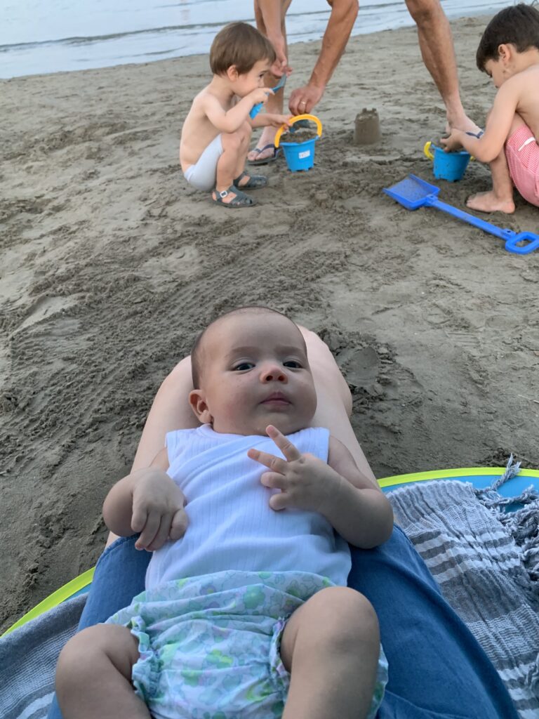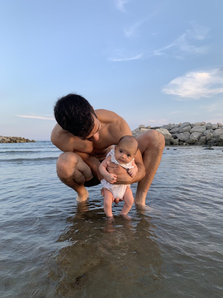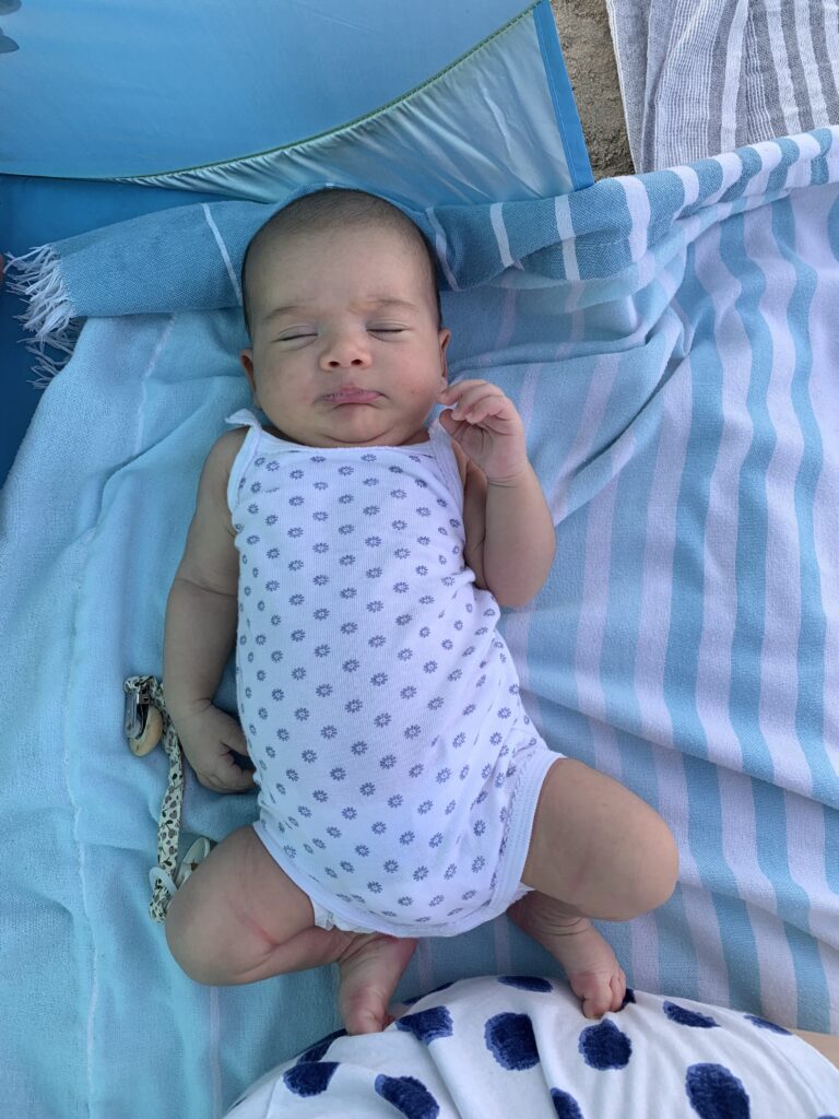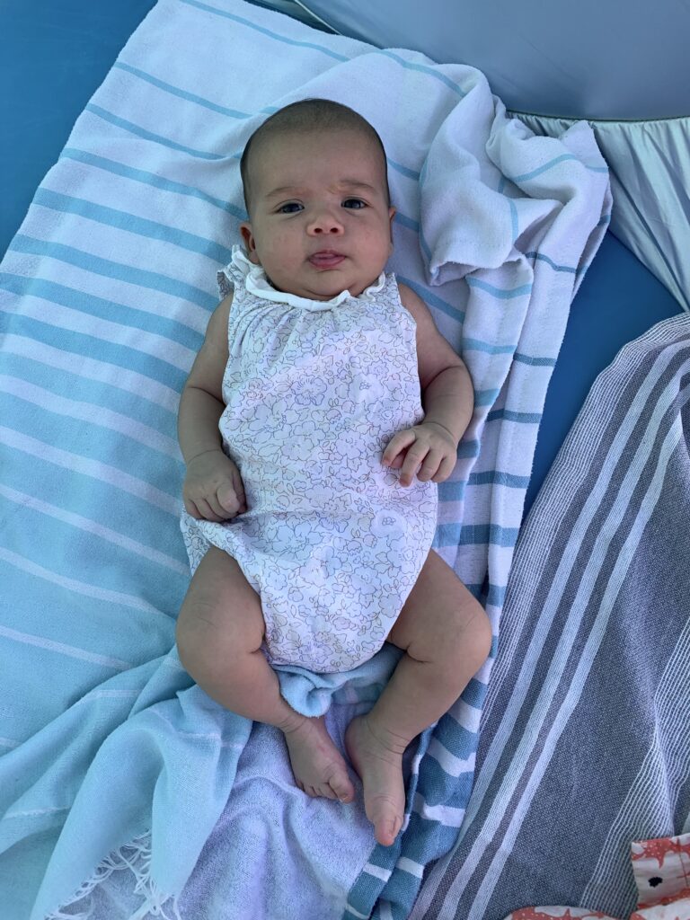 Première trempette dans la mer pour notre petit bébé ! Et elle est restée toute calme sans rien dire… un amour.