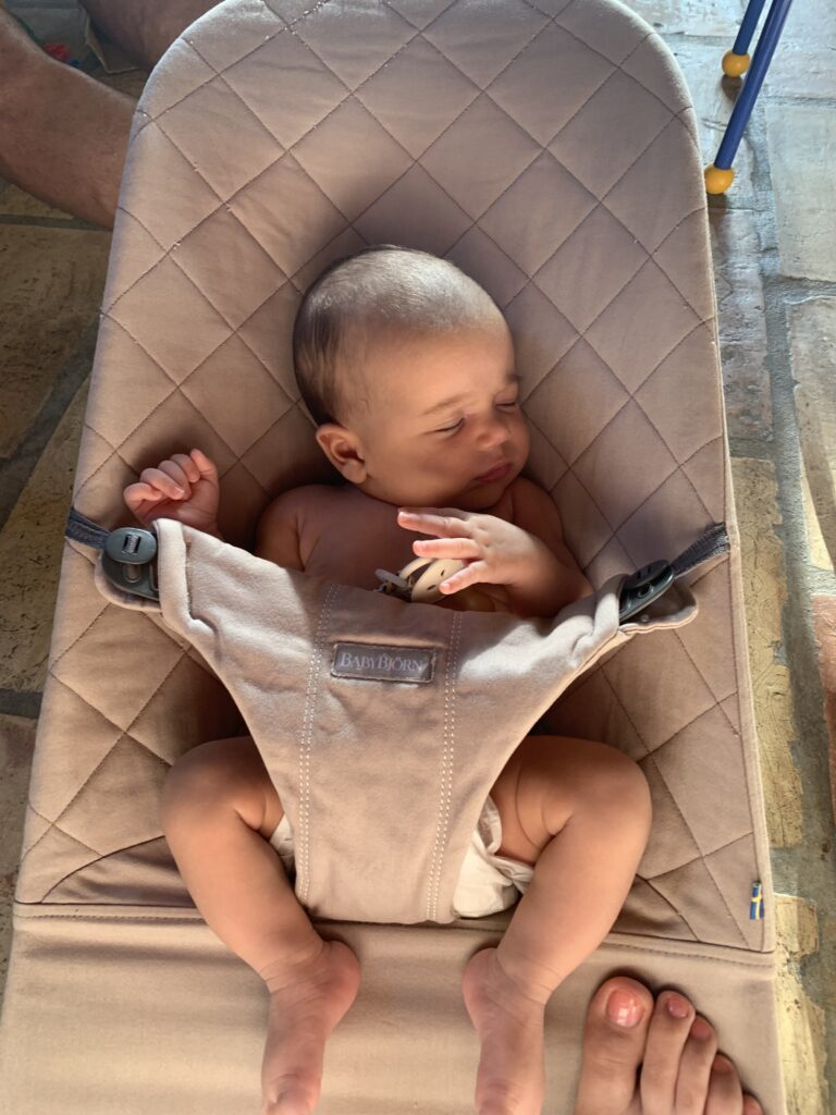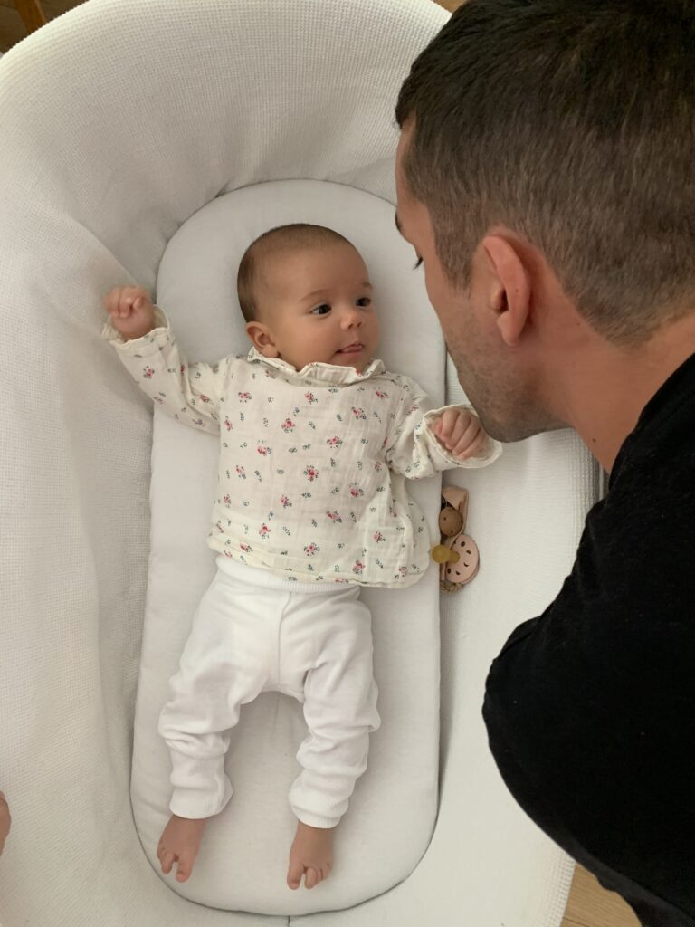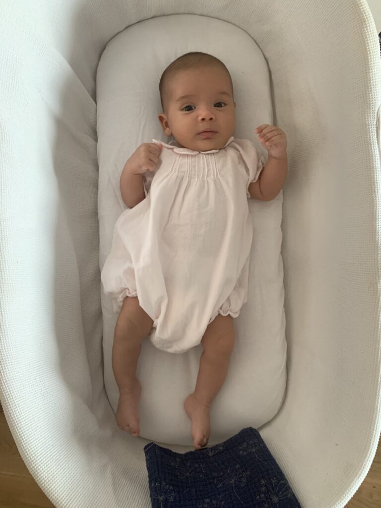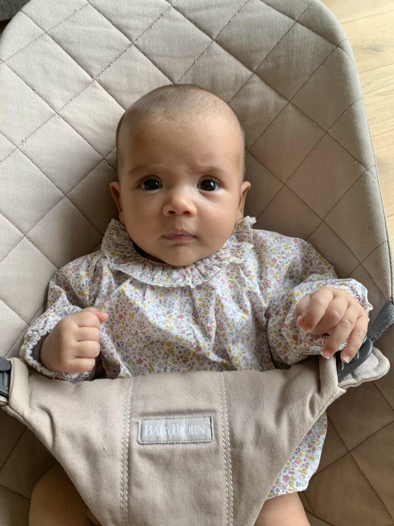 Elle commence à bien aimer s’écouter gazouiller, sourit et s’agite en regardant les suspensions de notre cuisine, adore être bercée dans son transat et être tout près de sa maman ❤️