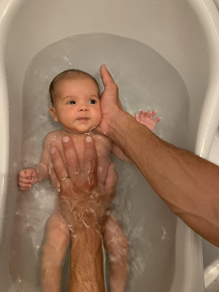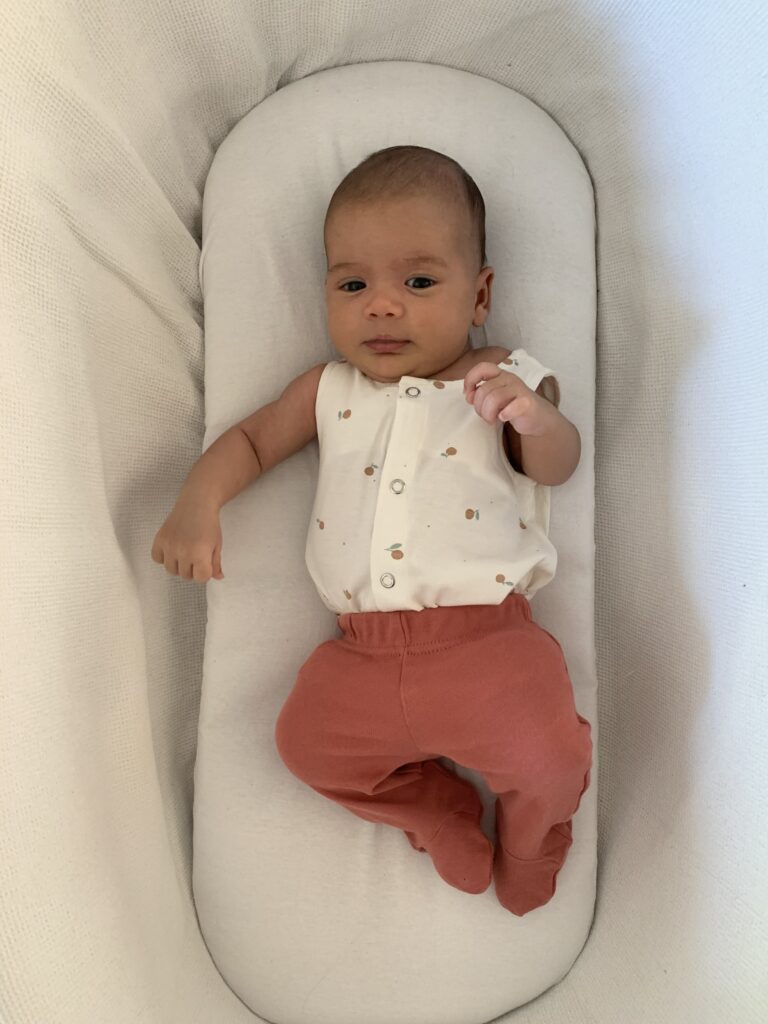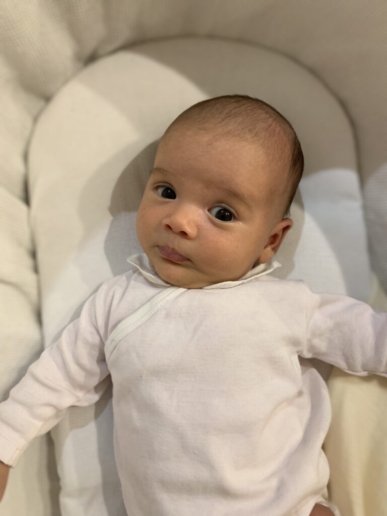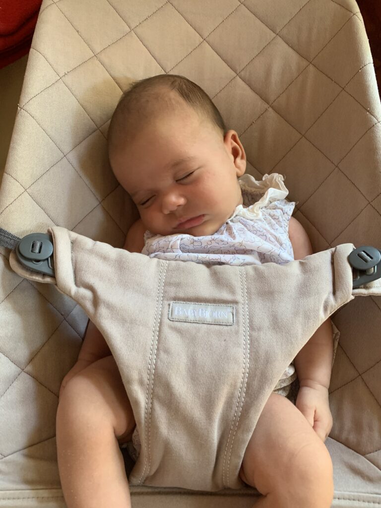 Elle commence à bien aimer s’écouter gazouiller, sourit et s’agite en regardant les suspensions de notre cuisine, adore être bercée dans son transat et être tout près de sa maman ❤️