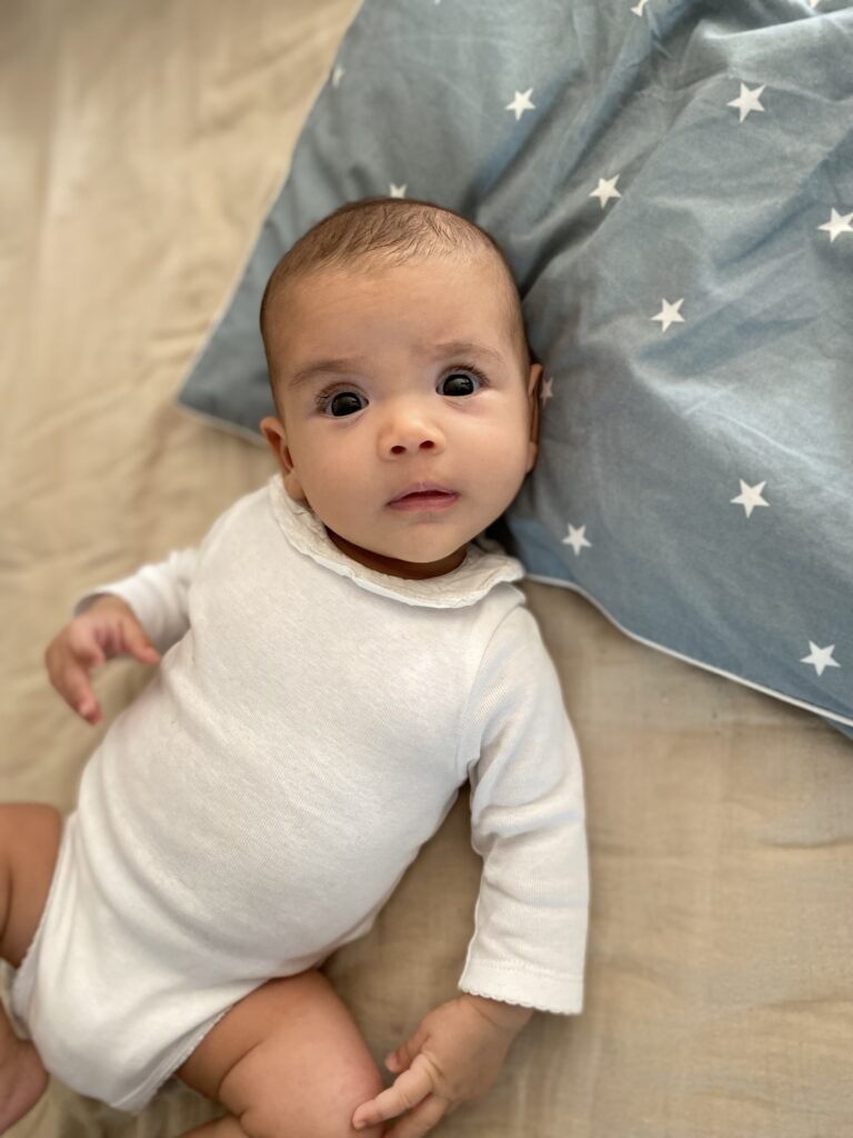 Sinon, que dire sur ce petit bébé ? Elle est trop belle, observe de plus en plus tout autour d’elle et fait des sourires incroyables. Elle mange toujours son poing et commence à bien regarder ses mains, c’est si mignon.