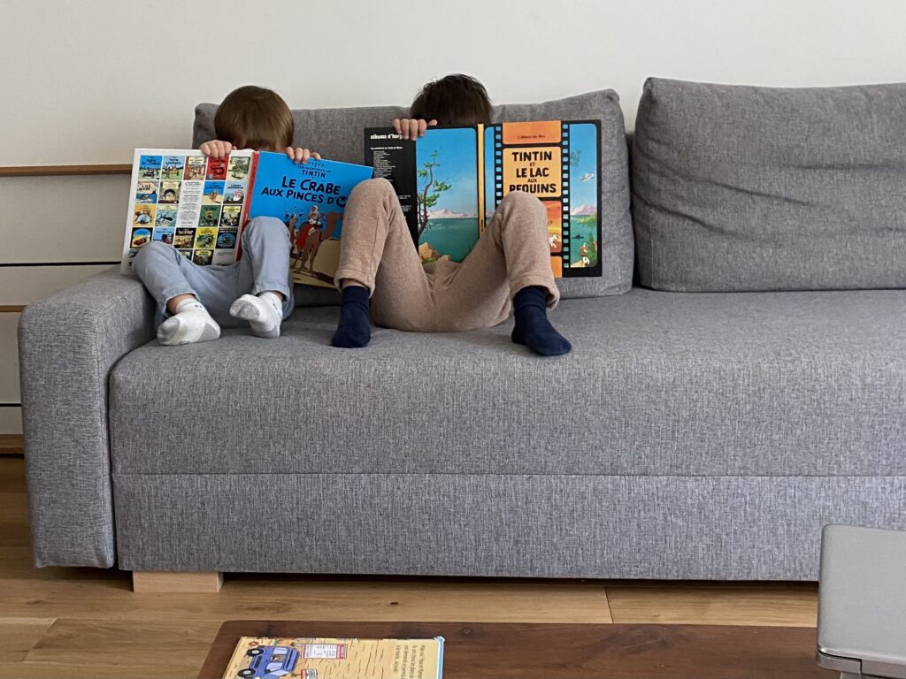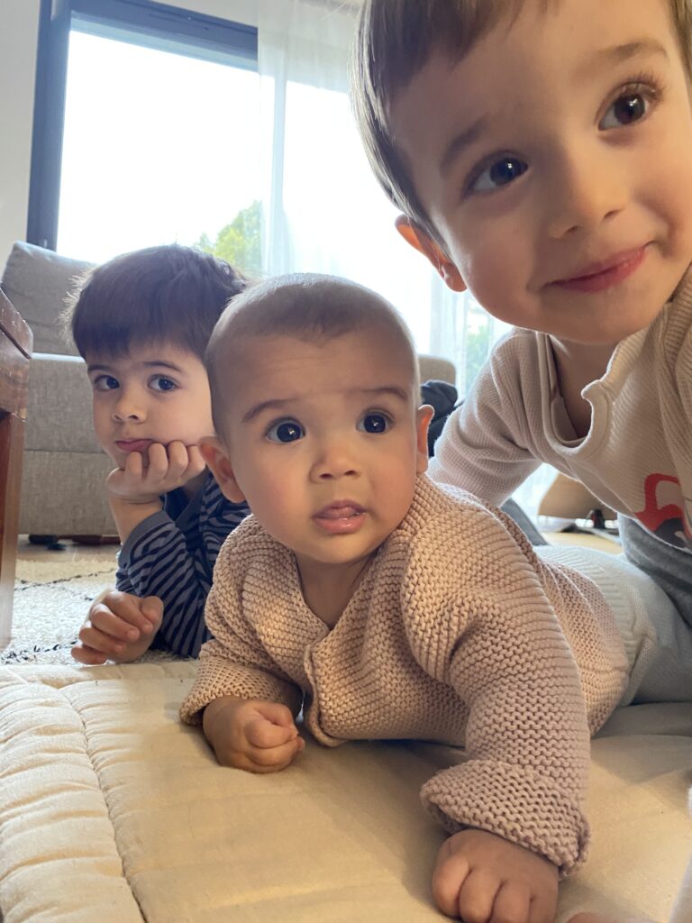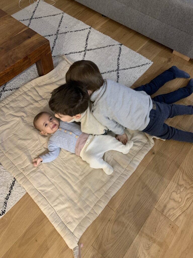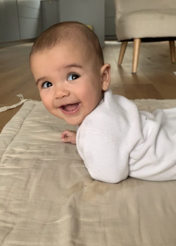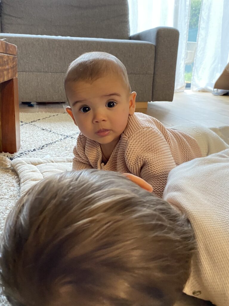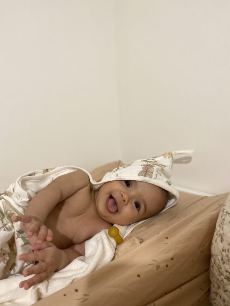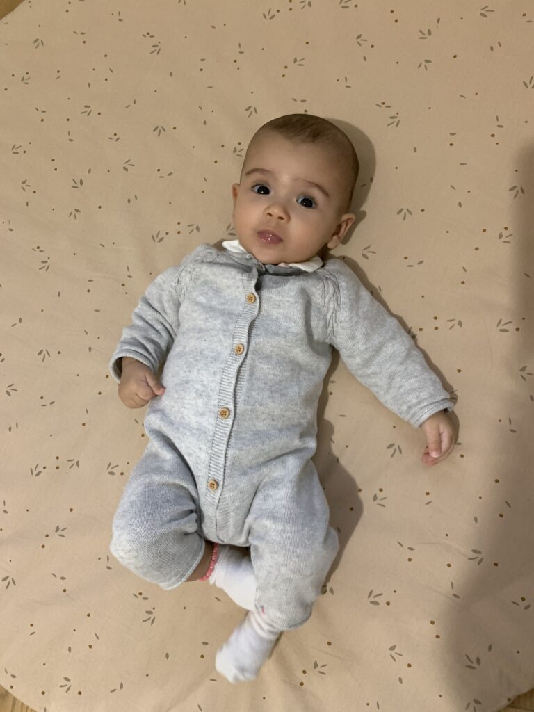 Physiquement, elle est toujours bien mate et bien brune. Et bien que l’allaitement soit toujours compliqué (et les nuits aussi), elle se porte bien et met du 3/6 mois.