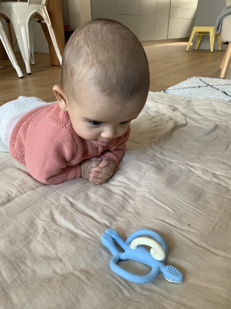 Elle aime regarder, attraper et mettre à la bouche ses petits jouets. Se mettre sur le ventre aussi, mais pas trop longtemps.