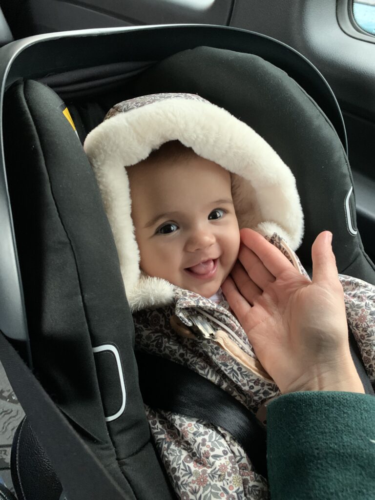 Ma Daphné est de toutes les aventures. À la suite de notre accident le mois dernier, je suis allée chercher puis rendre notre voiture de prêt à Lyon. Et cette petite frimousse m’a accompagnée partout, me faisant ses plus beaux sourires dans le taxi 🙂