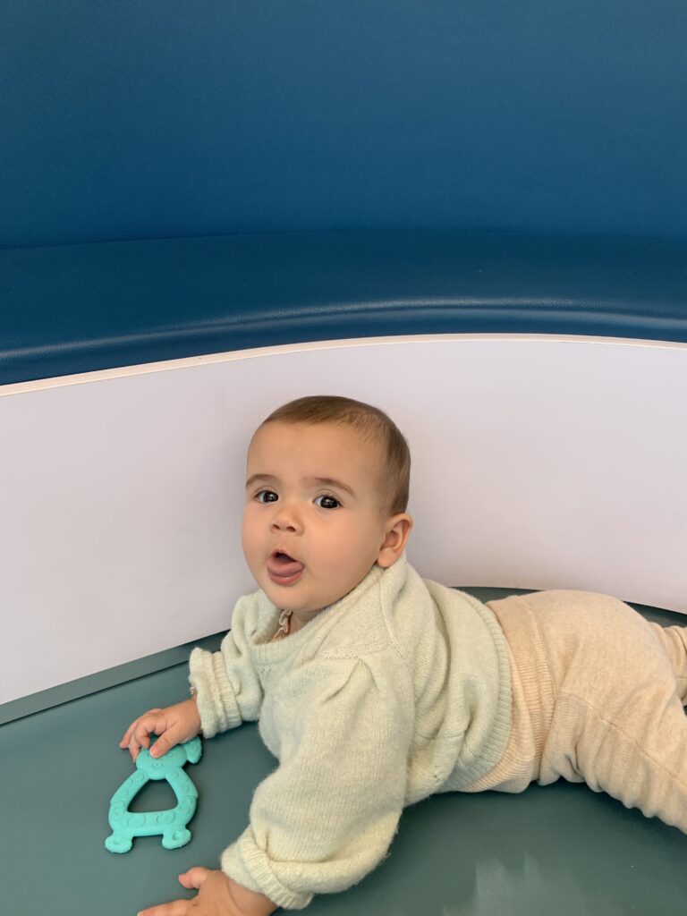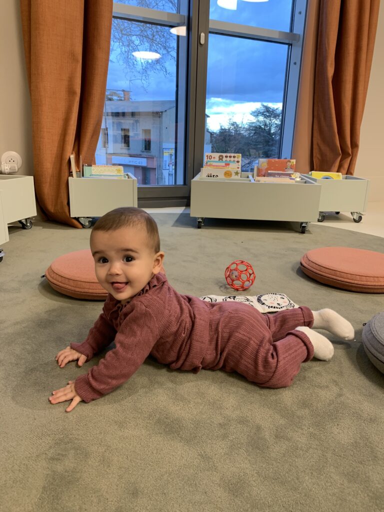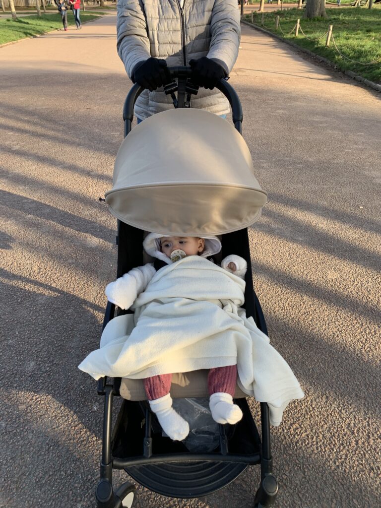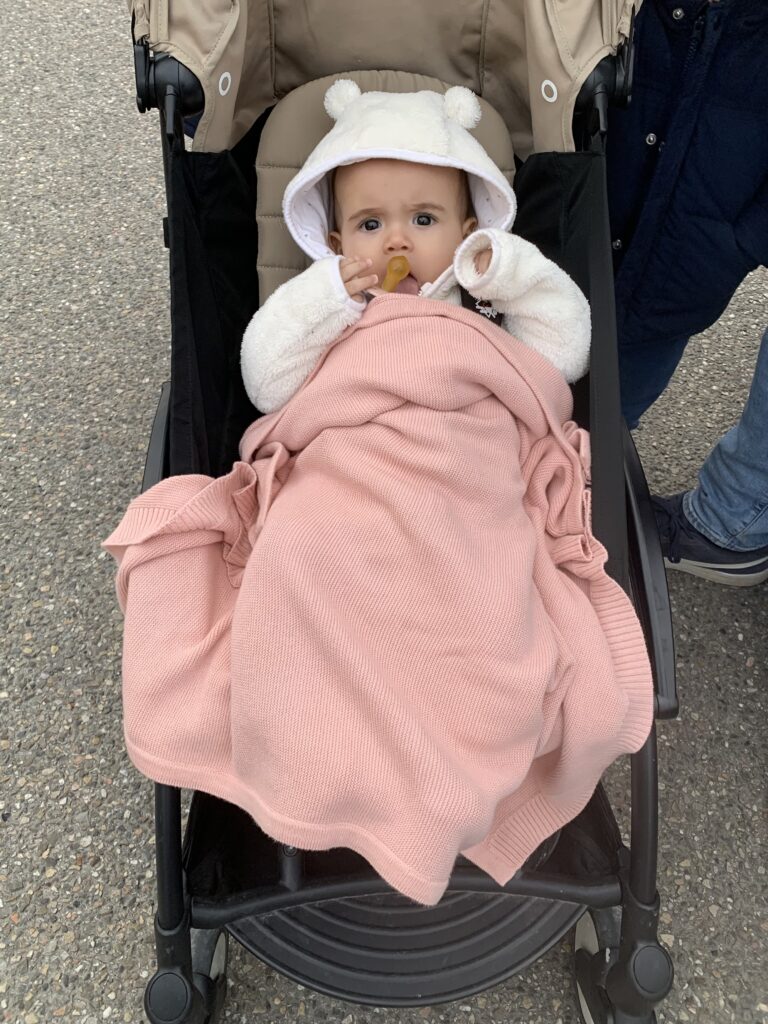 Quelques jours après ses 7 mois, Daphné est passée de sa nacelle de bébé à la poussette normale. Elle ne bouge pas et adore tout regarder 🙂