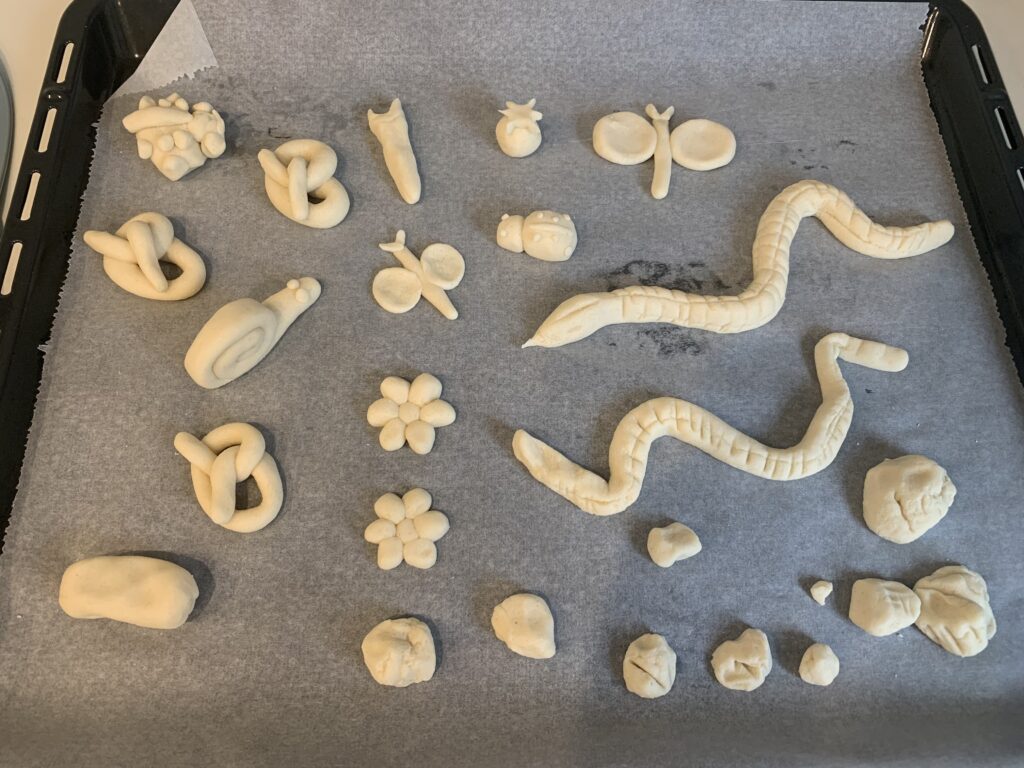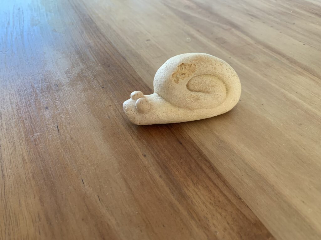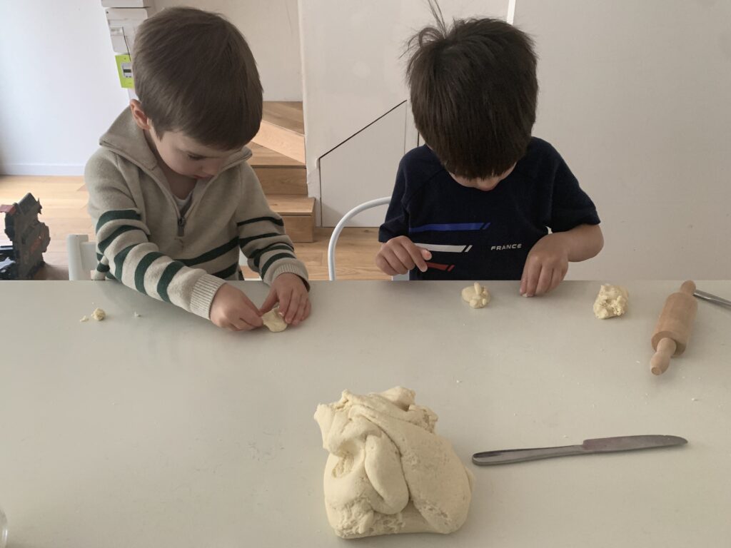 Attention, Armand ne quitte pas ses escargots en pâte à sel. Il en a oublié un chez des copains, en a cassé un autre… le drame à chaque fois, j’ai dû en refaire aussitôt (et cuire tout ça au four dans la foulée bien sûr). Heureusement que j’ai gardé de la pâte au frigo !