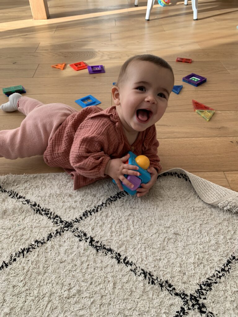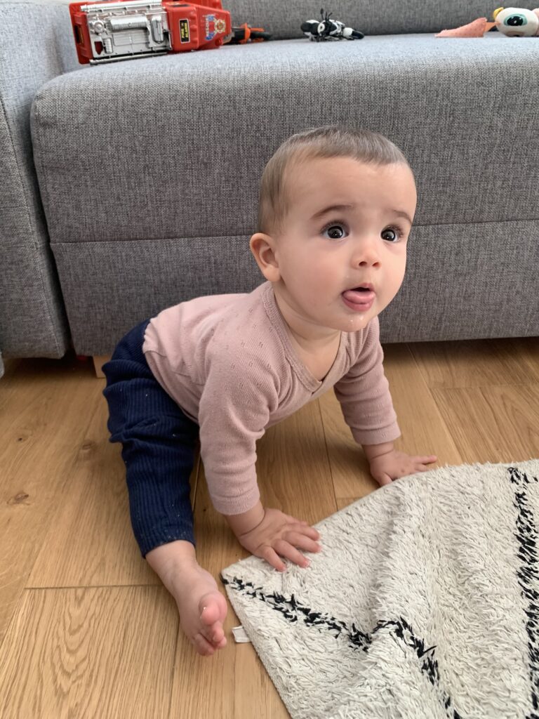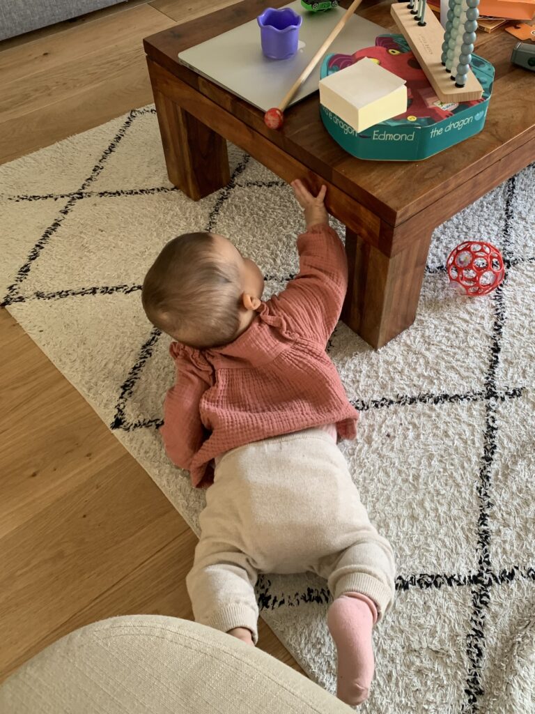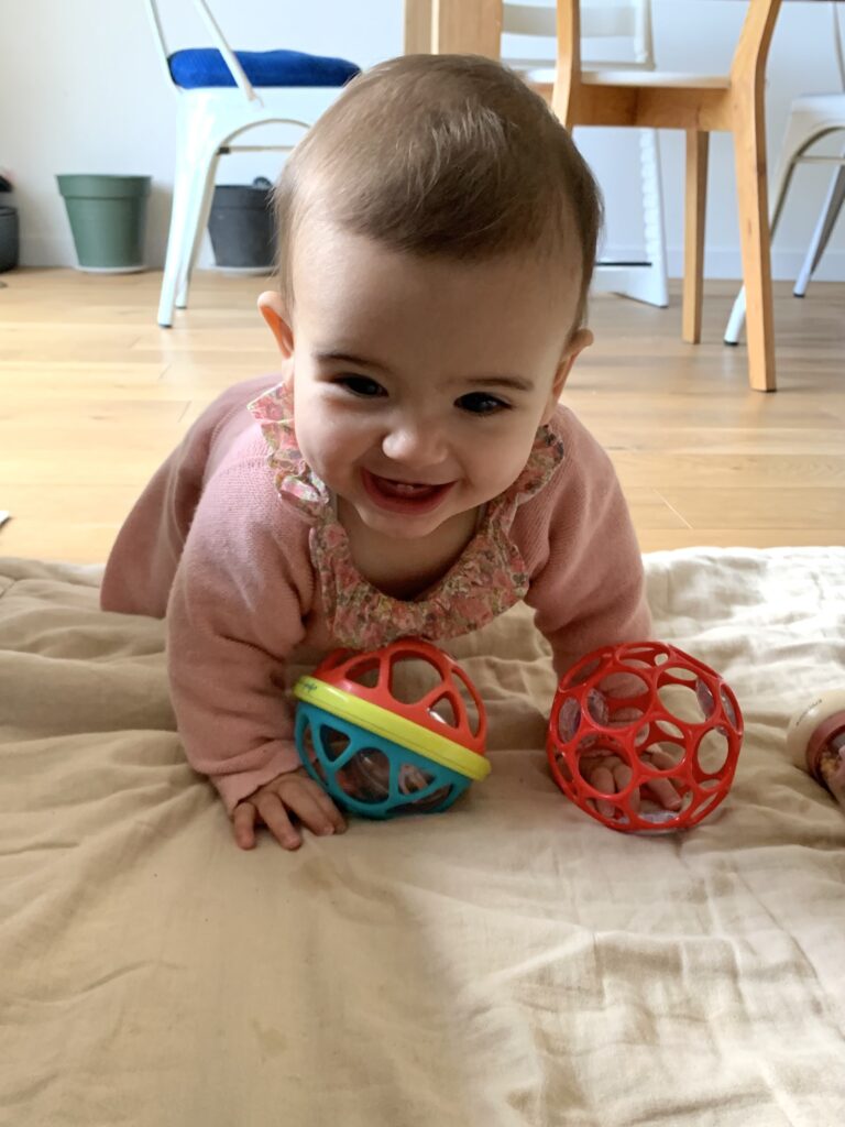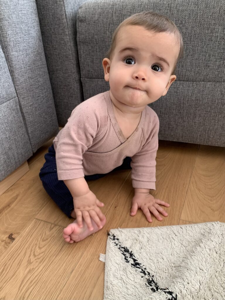 Elle ne fait toujours pas de quatre pattes mais rampe de plus en plus vite en poussant sur ses petits bras. Je dois barricader tous les endroits risqués, ça me rappelle des souvenirs !