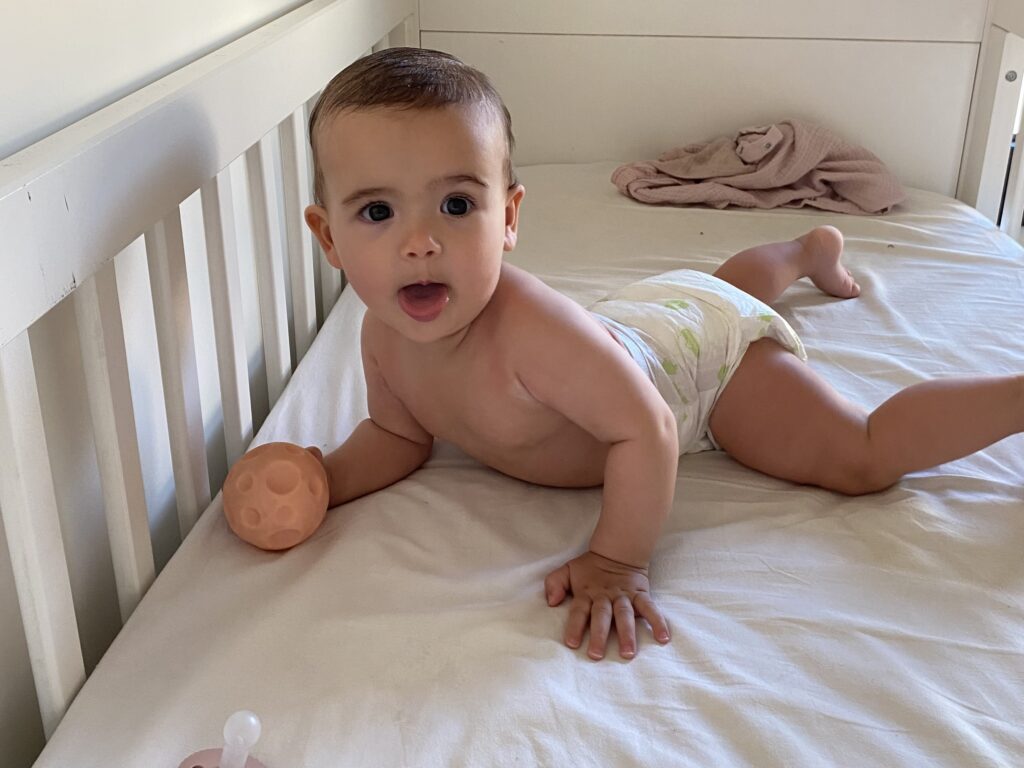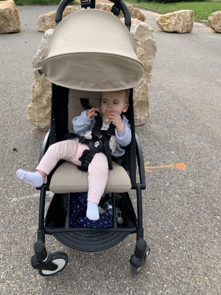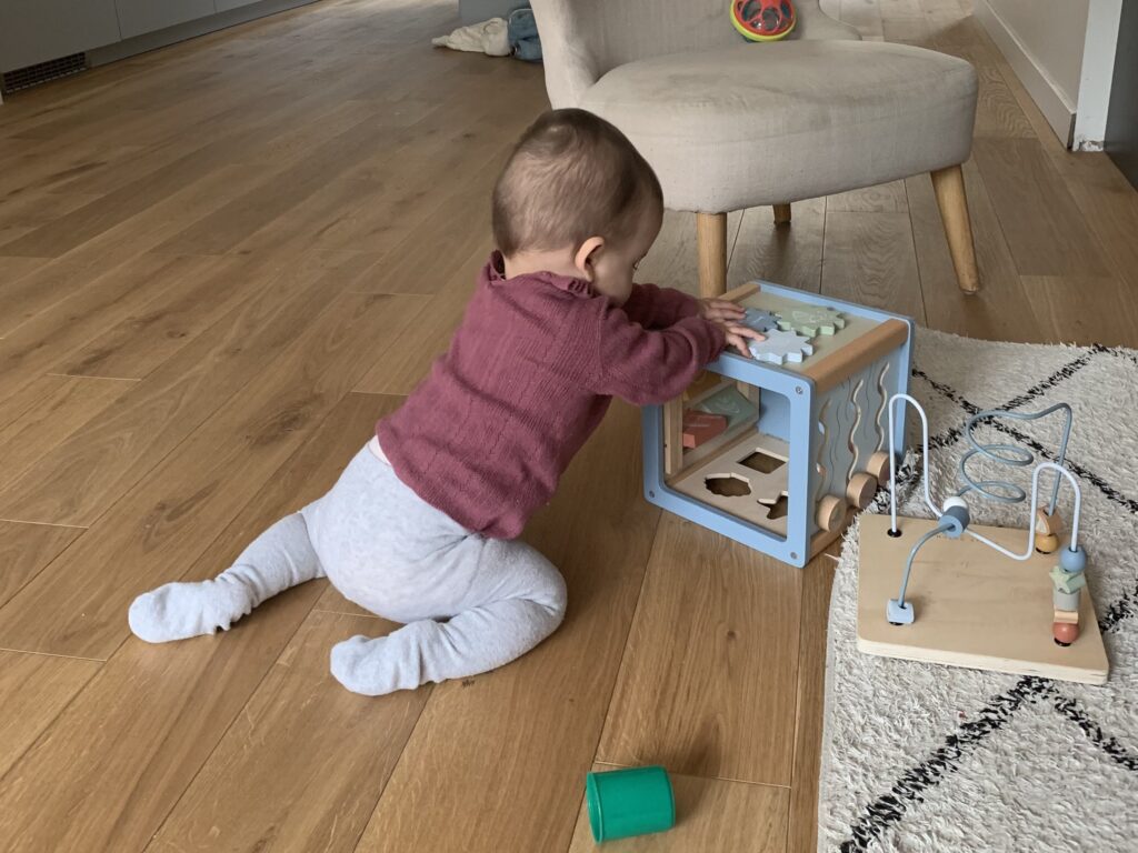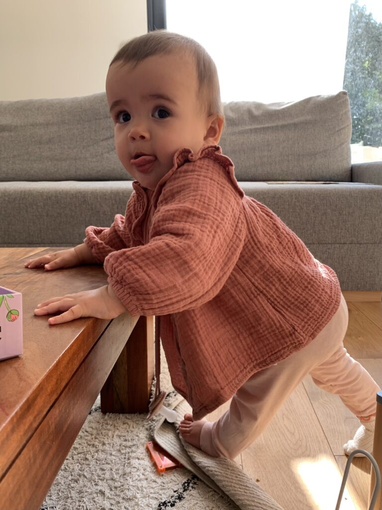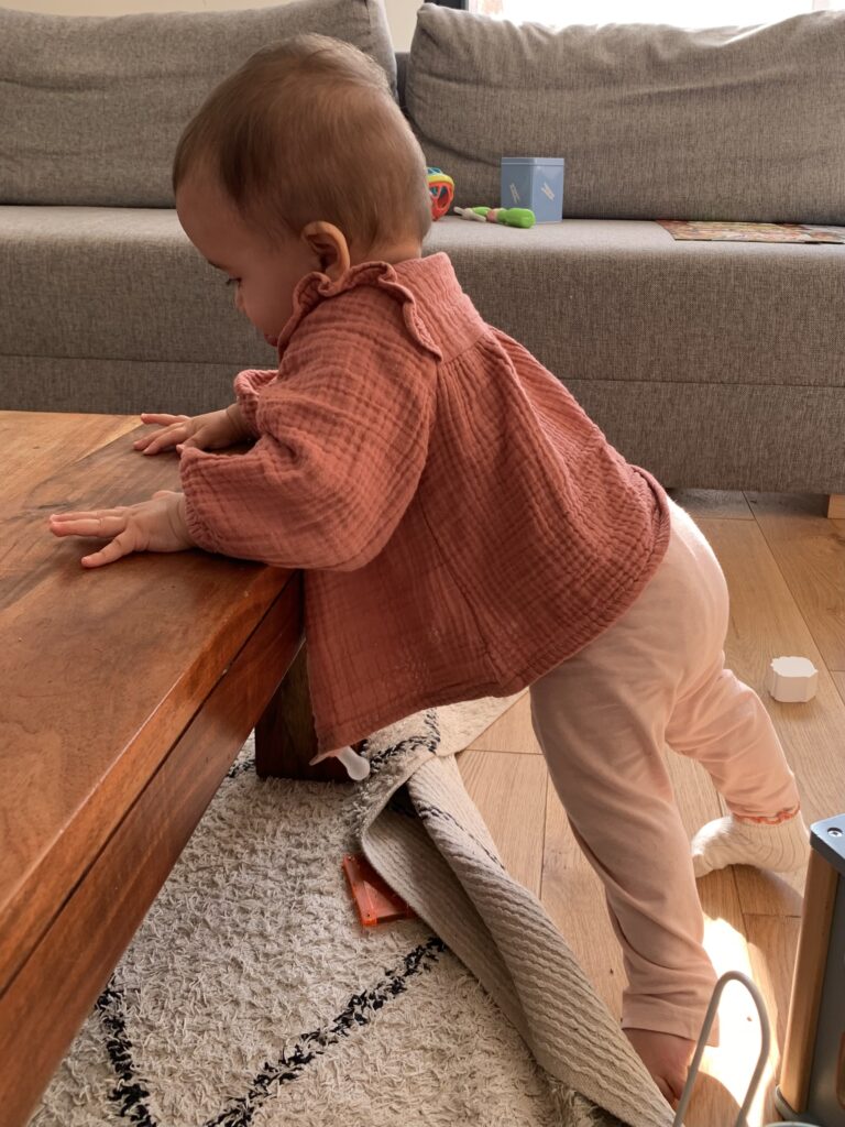 Et puis tout s’est accéléré la semaine dernière : une de ses dents du haut a percé, elle a commencé à vraiment manger (pas de purée, pas de cuillère, mais des morceaux comme nous, dans ses mains), elle a réussi à vraiment s’asseoir toute seule sur ses deux fesses, et bien sûr elle s’est mise debout en se tenant à la table basse. Ça arrive vraiment d’un coup à chaque fois. Et depuis, elle ne s’arrête plus. Le seul hic, les chutes en arrière et sur la tête… c’est jamais drôle !