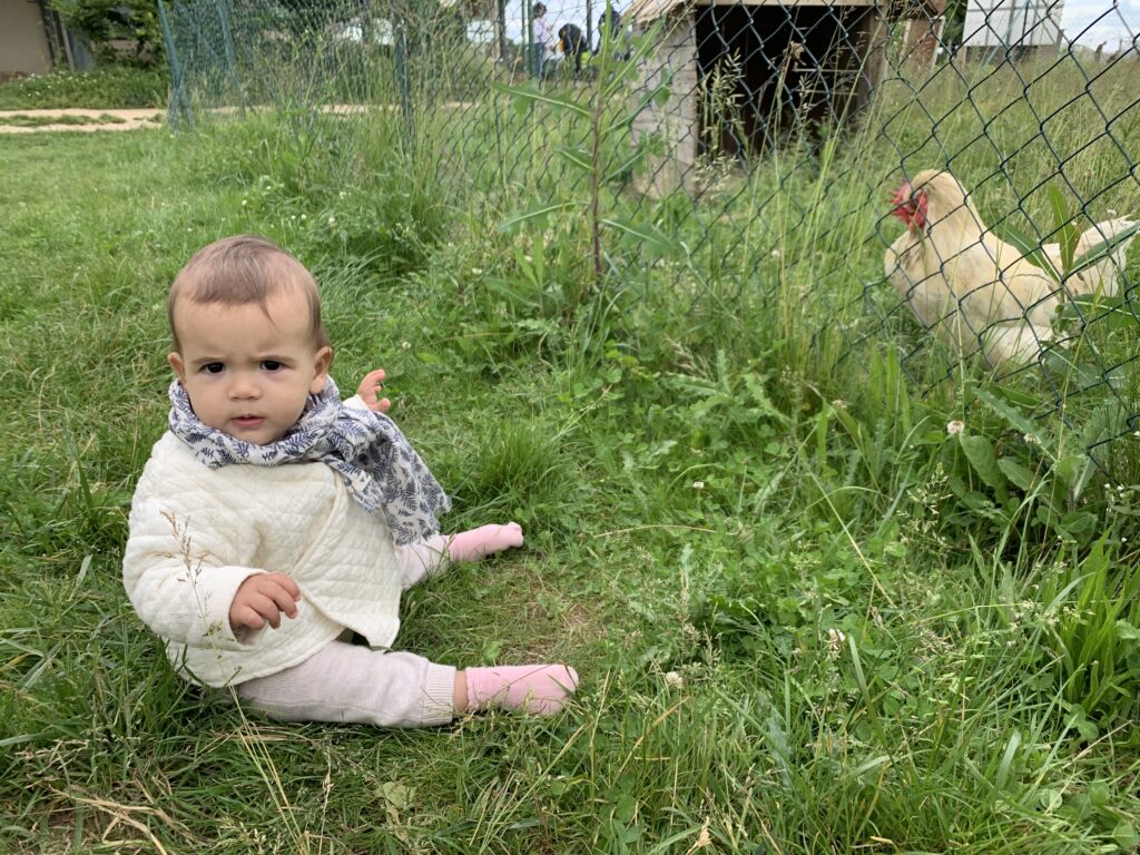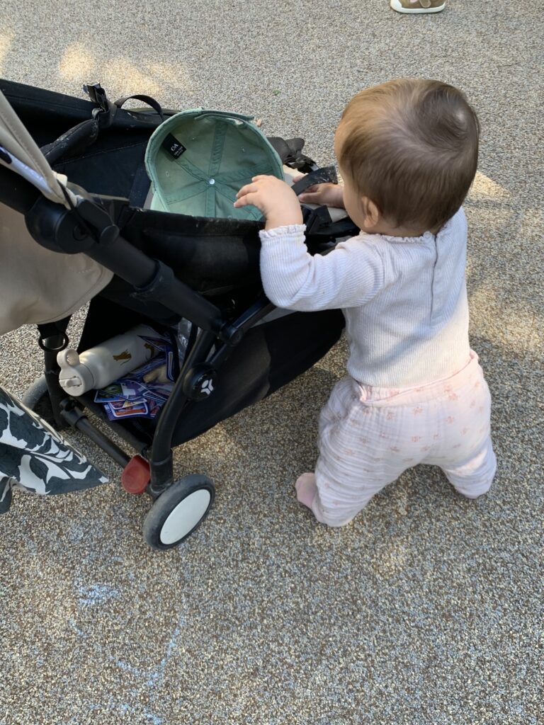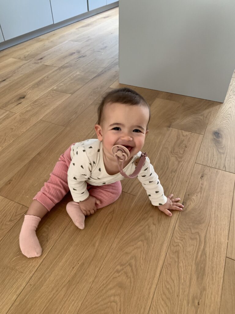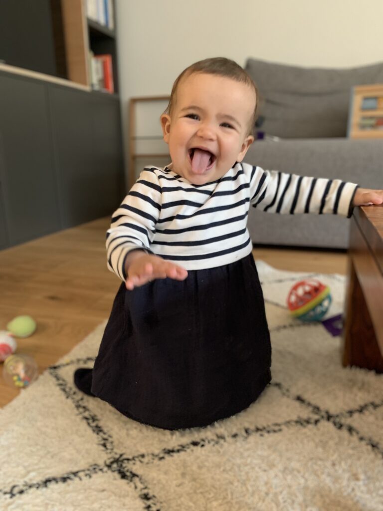 En général, elle m’appelle quand ça ne va pas, quand elle a faim ou qu’elle en a marre de faire du quatre pattes et qu’elle veut grimper sur moi. Car oui elle fait aussi du quatre pattes depuis 3 semaines !