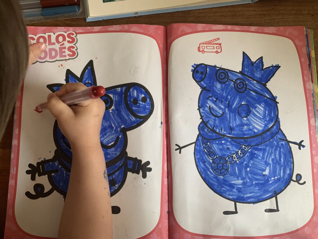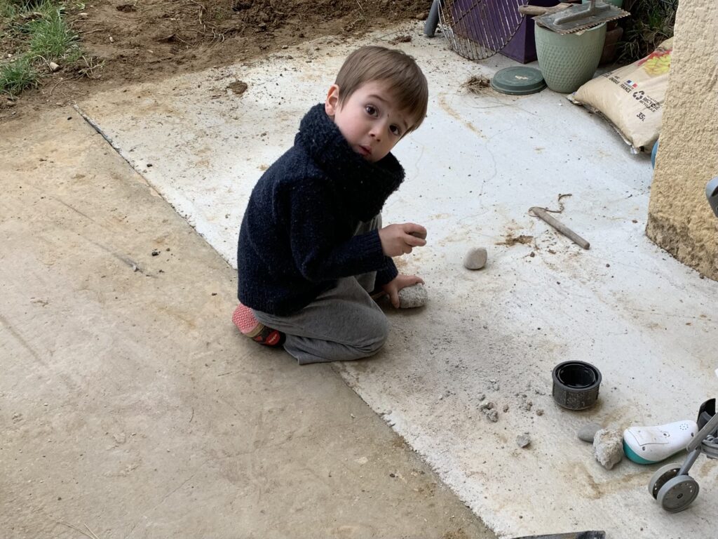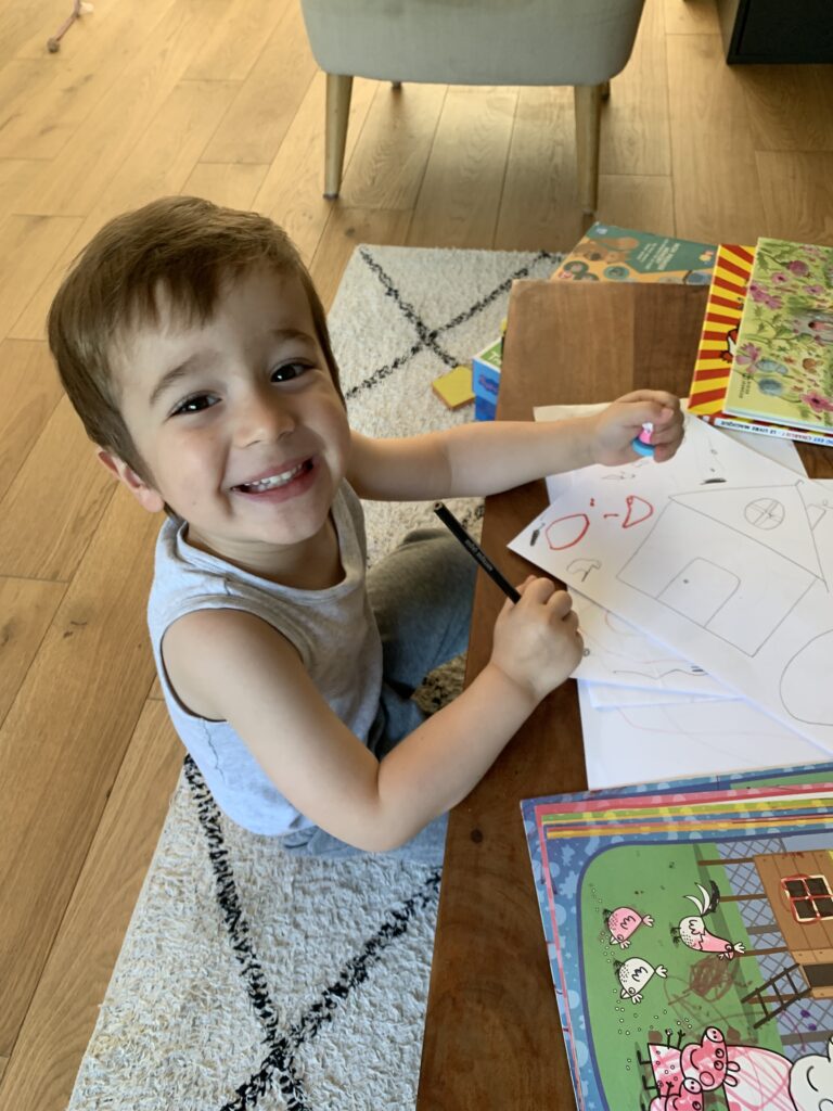 Les choses qu’il adore : manger, les escargots (son escargot en pâte à sel ne le quitte pas et tout le monde le connaît, même à l’école !), colorier/dessiner, Peppa Pig, bricoler et faire des travaux, faire de la trottinette/draisienne. Et surtout : les câlins et les bisous.