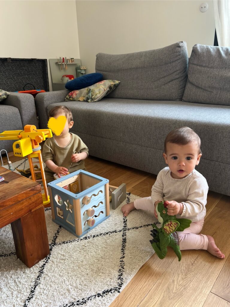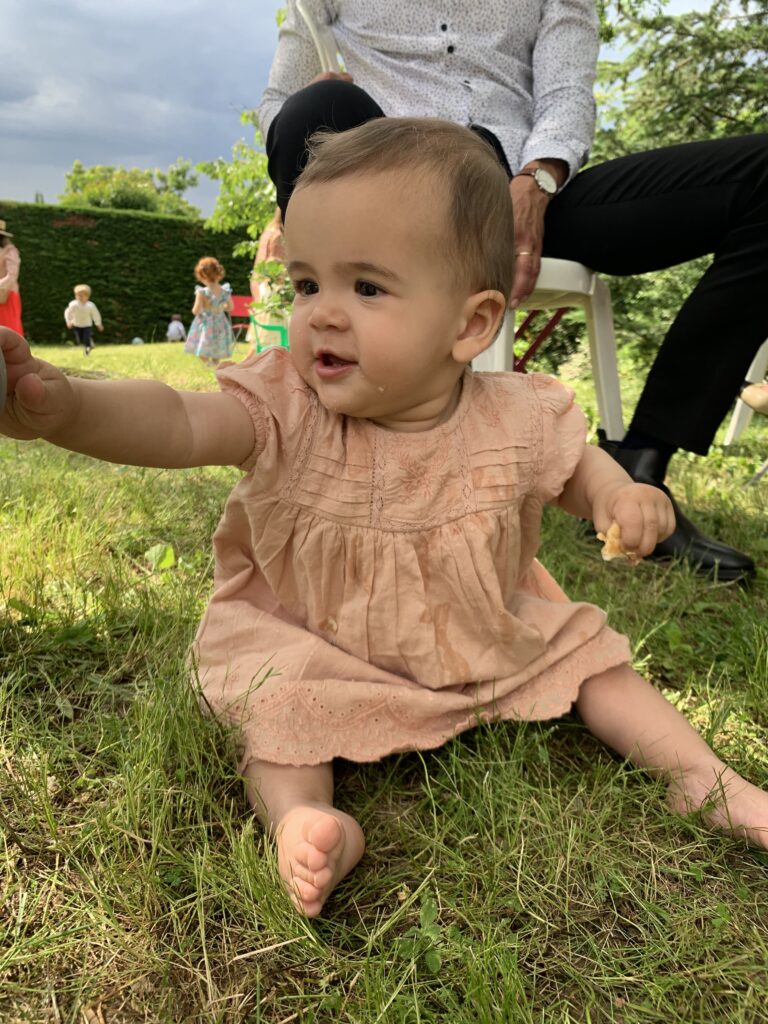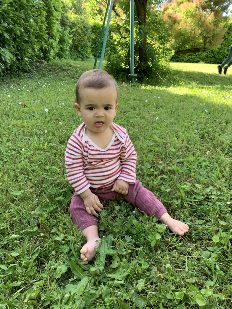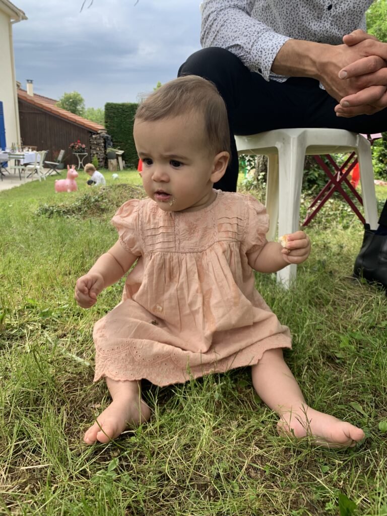 Et puis tout s’est accéléré la semaine dernière : une de ses dents du haut a percé, elle a commencé à vraiment manger (pas de purée, pas de cuillère, mais des morceaux comme nous, dans ses mains), elle a réussi à vraiment s’asseoir toute seule sur ses deux fesses, et bien sûr elle s’est mise debout en se tenant à la table basse. Ça arrive vraiment d’un coup à chaque fois. Et depuis, elle ne s’arrête plus. Le seul hic, les chutes en arrière et sur la tête… c’est jamais drôle !
